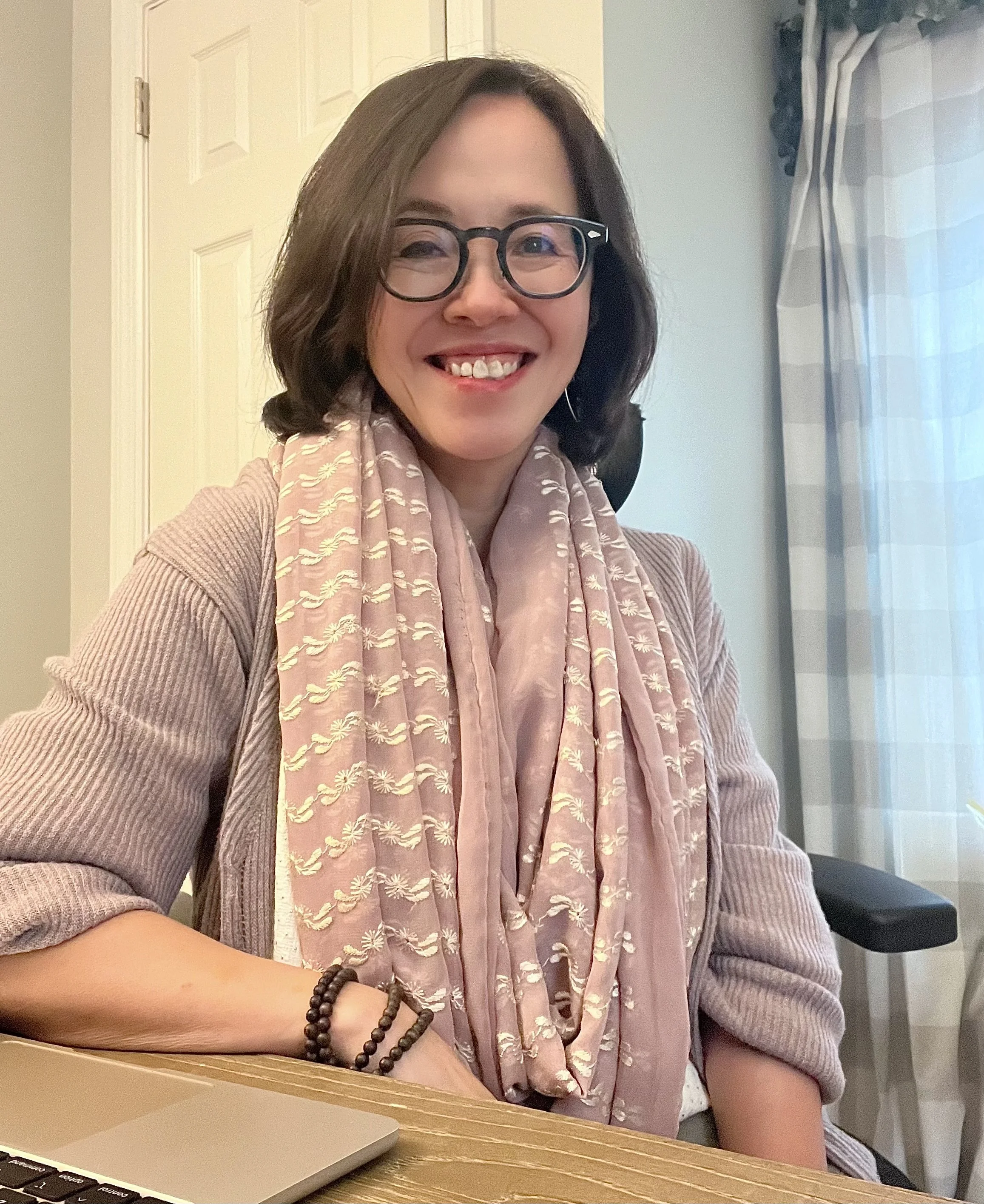 Smiling person wearing glasses and a pink scarf, sitting at a desk with a laptop.